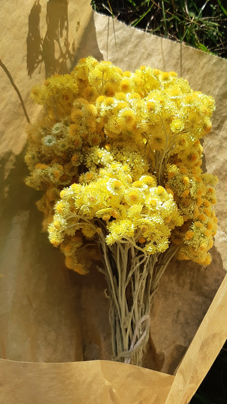 Zdjęcie przedstawia produkt w formie, w jakiej jest sprzedawane. Jest to wiązka złożona z kilkunastu łodyżek, związanych sznurkiem bawełnianym i owinięta papierem do pieczenia.
